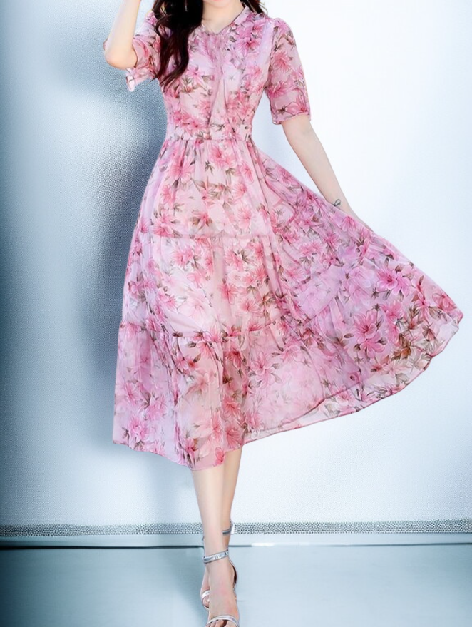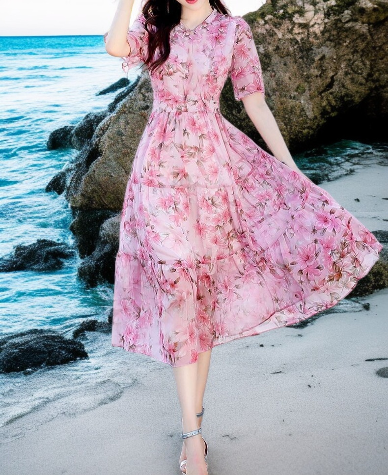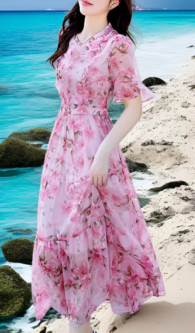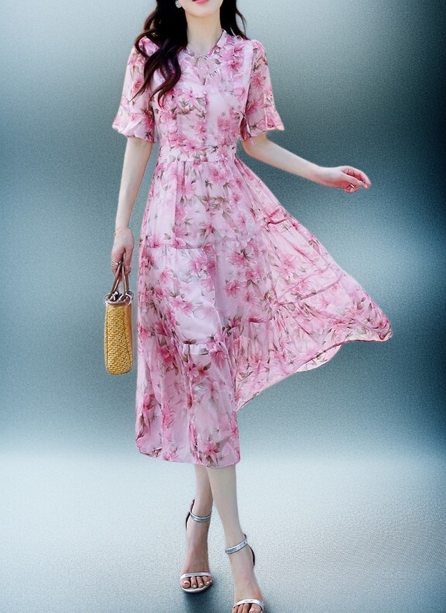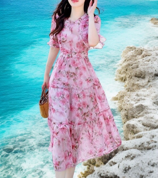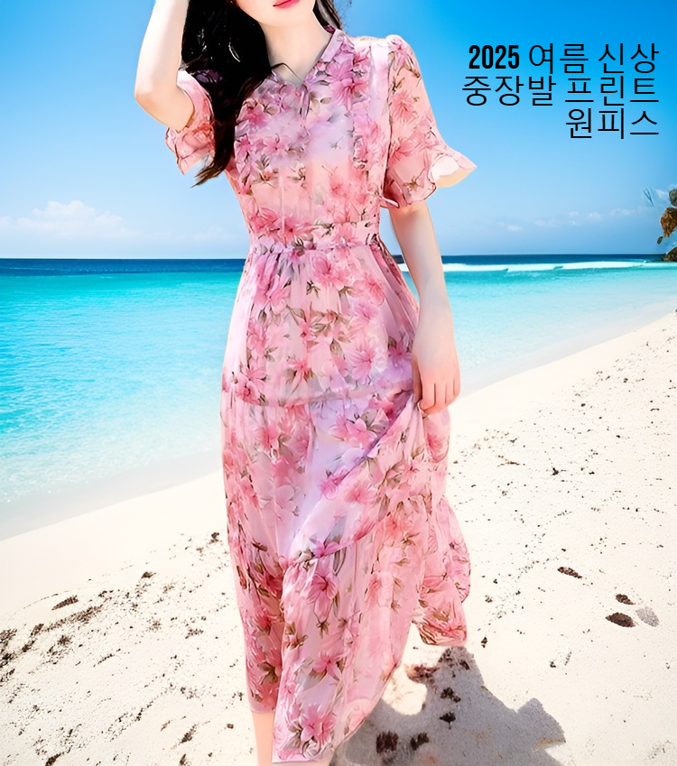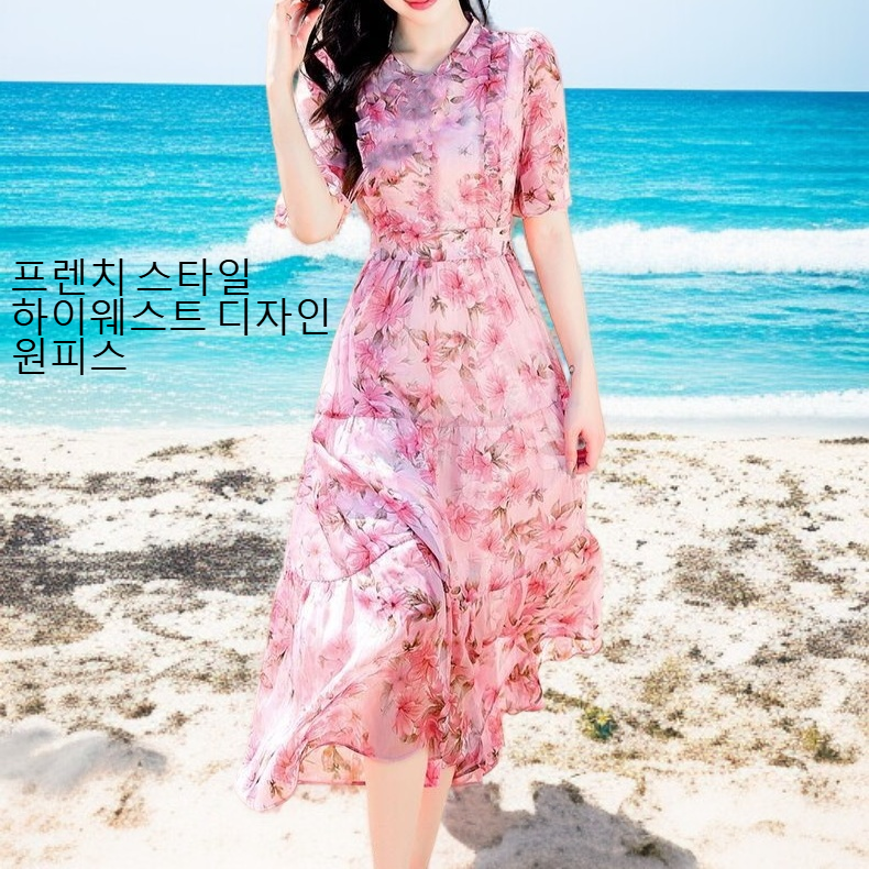 트렌디한 프린트 디자인, 미디엄 롱 길이로 편안한 착용감, 다양한 스타일 연출 가능, 데일리룩에 적합한 원피스.