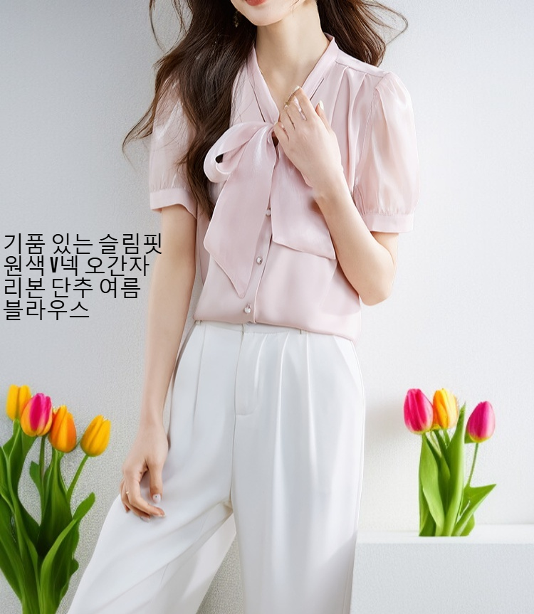 여성용 여름 단색 V넥 블라우스, 시원한 소재와 심플한 디자인, 다양한 코디에 적합, 데일리룩으로 활용도 높음.